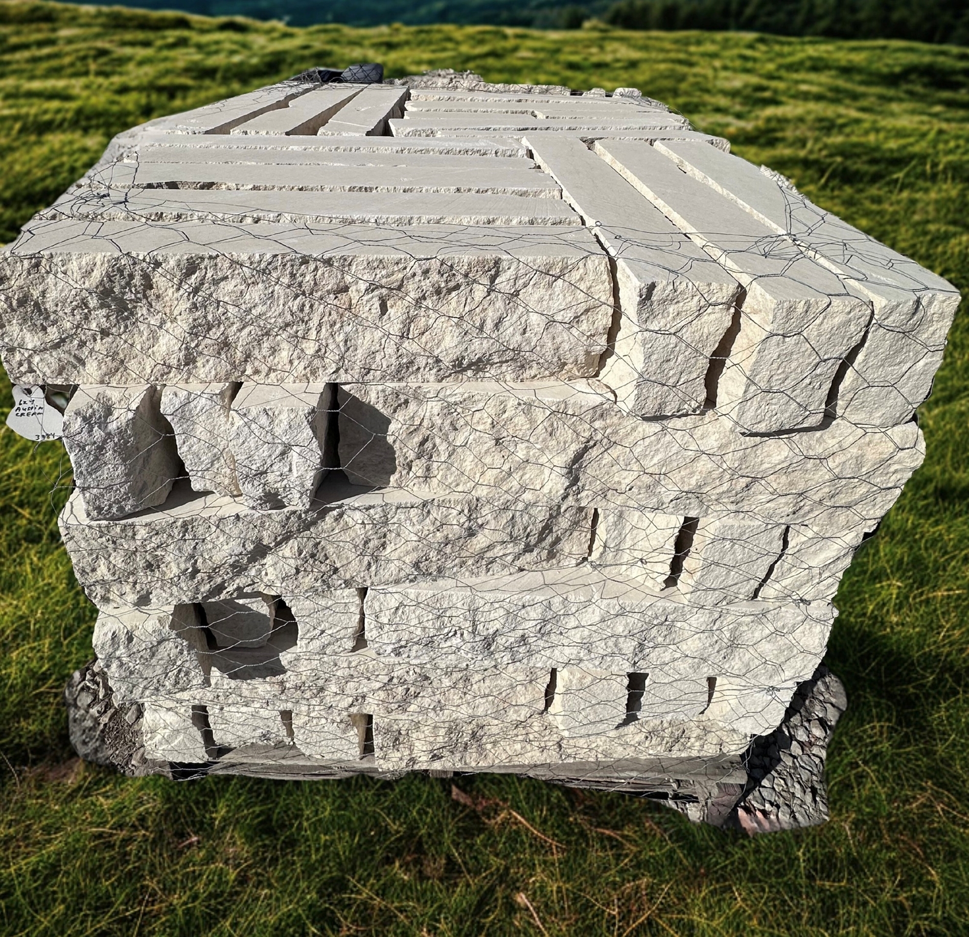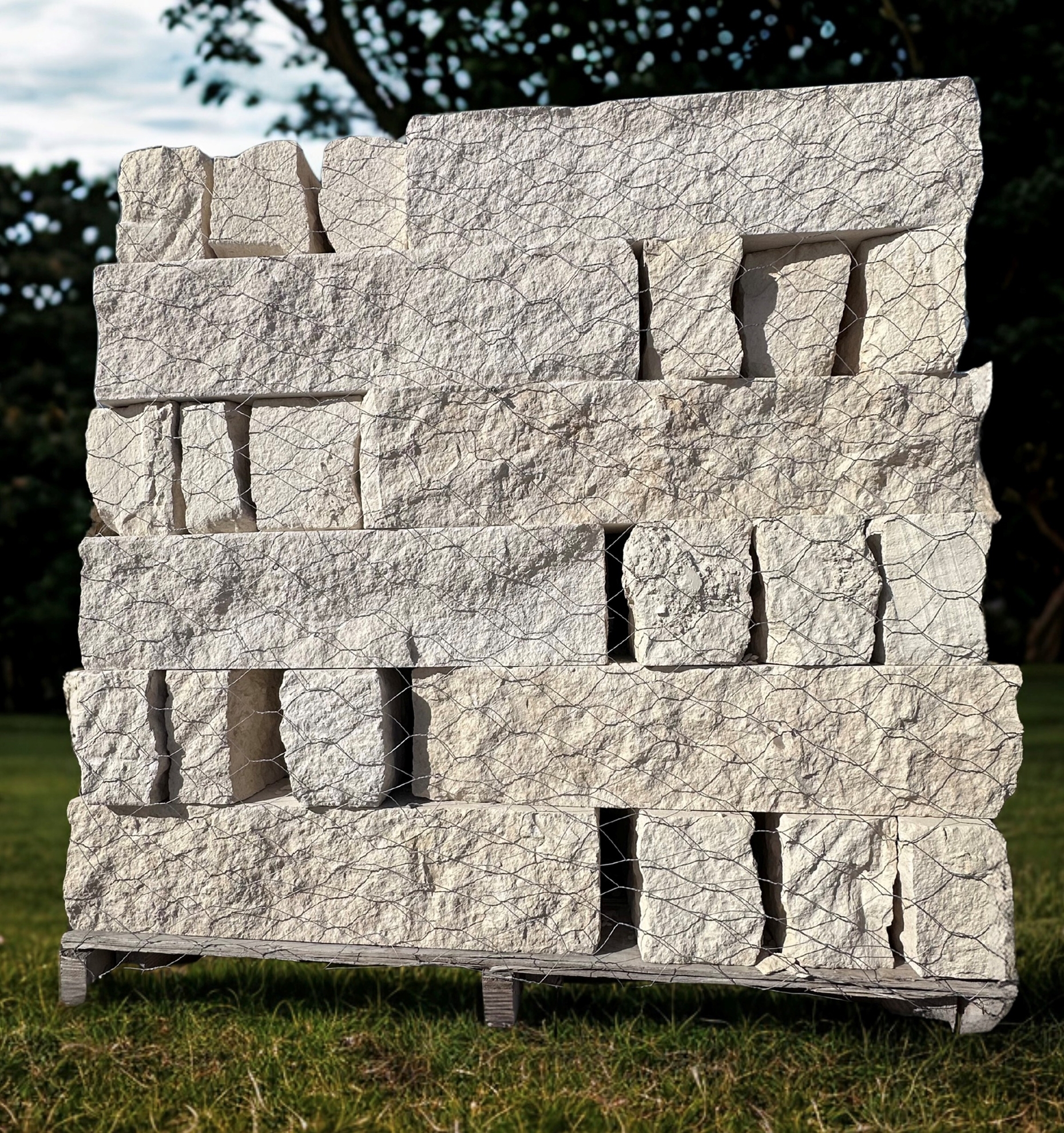 Cream chopped stone with rust or grey accents that measures 4 inch by 6 inch in random lengths. This is a very popular stone for borders, retaining walls, mail boxes, well houses or accent stone for homes. It is available in White, Sunflower, Nicotine, and Cream colors.